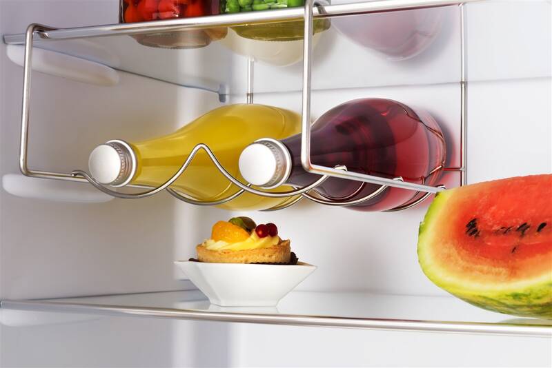 Chladicí části je věnován prostor s čistým objemem 181 l. Vnitřek je přehledně rozdělen 4 policemi z kvalitního pevného skla, z toho jsou 3 výškově nastavitelné. Příjemným benefitem je kompaktní držák na 2 láhve.