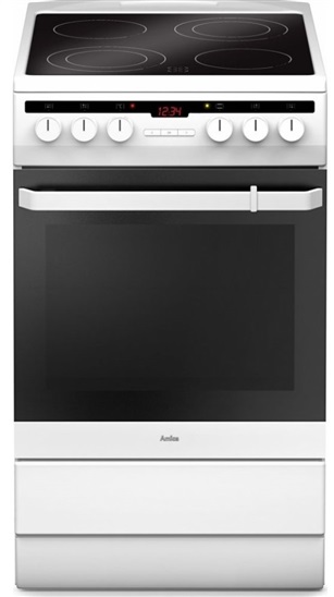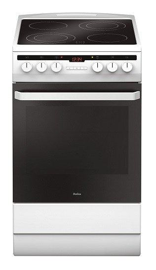 Amica SHC 5874 W - elektrický sporák • energetická třída A • 4 varné zóny • objem trouby 62 l • sklokeramická varná deska • max. příkon 8,9 kW • připojení k síti 400 V • 10 druhů ohřevu • trojité sklo • odkládací prostor • horký vzduch • rozmrazování • ukazatel zbytkového tepla • otočné ovládání • displej/hodiny • 85×50×60 cm