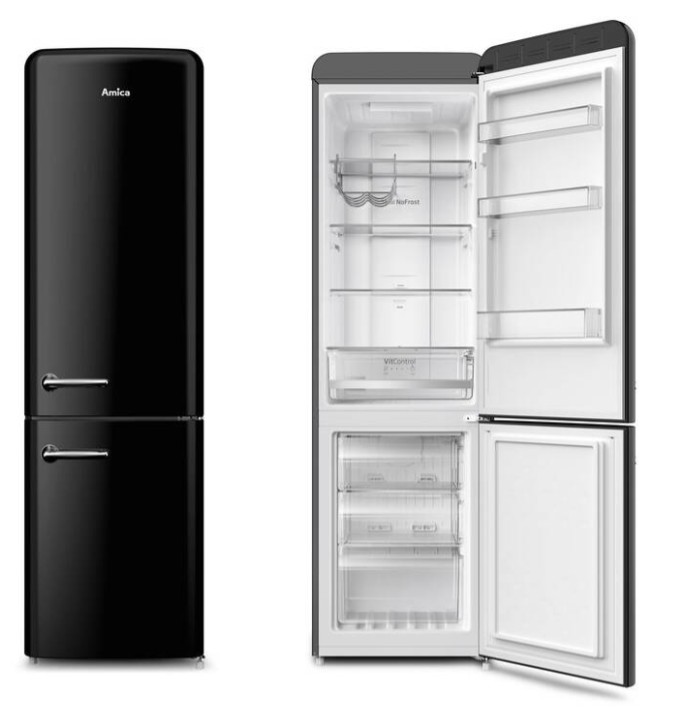Beznámrazová chladnička Amica VCN 1862 B je volně stojící kombinovaná chladnička, která se pyšní moderním černým retro designem. Nabízí chladicí prostor o objemu 180 litrů a mrazicí část s kapacitou 70 litrů. Díky technologii Total No Frost se nemusíte starat o odmrazování, protože systém suchého vzduchu zamezuje tvorbě námrazy.
