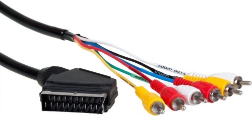 Kabel plně zapojený 21 pin scart - 6x cinch konektor, délka 1,5m, výstup i vstup kompozitní video + audio stereo.