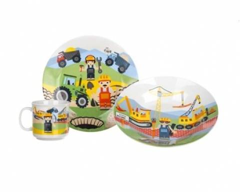 Dětská jídelní sada THE BUILDERS, 3 ksDětská 3dílná sada THE BUILDERS je složena z hlubokého a mělkého talíře o průměru 20 cm, hrnečku o objemu 210 ml. Sada je vyrobena z keramiky s dekorem stavitelé.