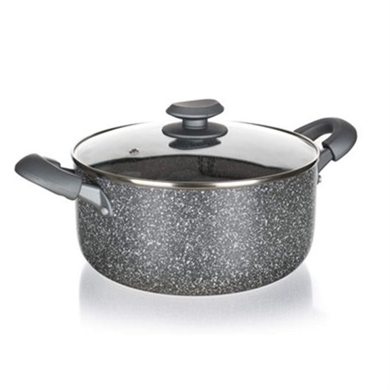 Hrnec s nepřilnavým povrchem GRANITE PR 24 x 11 cm, se skleněnou poklicíHliníkový presovaný kastrol GRANITE 24 x 11 cm s nepřilnavým 2vrstvým povrchem v granitovém dekoru, šedou bakelitovou rukojetí se soft-touch povrchovou úpravou a plně indukčním dnem.