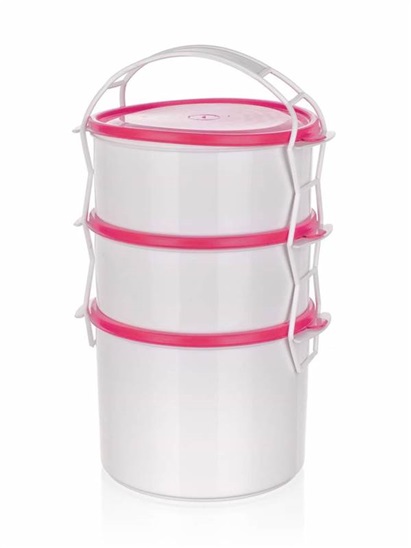 3dílný plastový jídlonosič se 3 dózami o objemu 2 x 1 l a 1,5 l je určený k přenášení potravin a hotových pokrmů. Dózy lze použít i samostatně pro skladování potravin v ledničce, mrazničce a ohřívání pokrmů v mikrovlnné troubě. Dózy jsou vyrobenyz odolného plastu, jsou použitelné při teplotách od -40 do +90 st.C a jsou vhodné do myčky na nádobí.