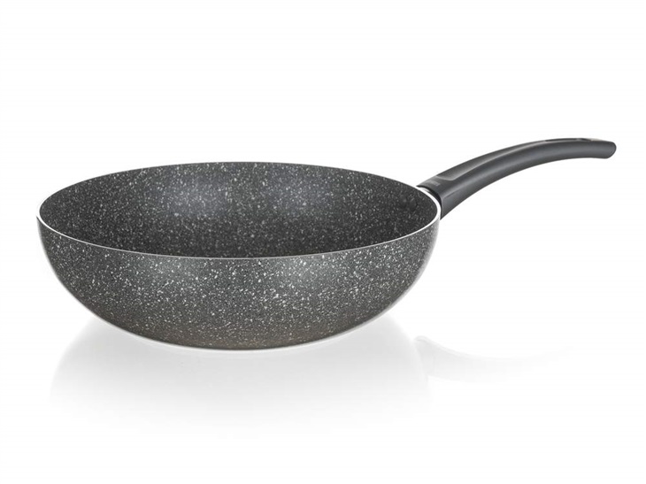 Pánev WOK s nepřilnavým povrchem GRANITE PR 28 x 8 cm, indukceHliníková presovaná pánev WOK GRANITE 28 x 8 cm s nepřilnavým 2vrstvým povrchem v granitovém dekoru a šedou bakelitovou rukojetí se soft-touch povrchovou úpravou. Pánev je vhodná na všechny typy varných desek včetně indukce.