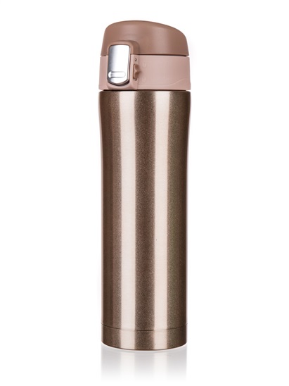 Termoska BODO 430ml zla.met.; Cestovní termoska BODO o objemu 430 ml má vnější i vnitřní povrch z nerezi a plastové vyklápěcí víčko. Díky dvoustěnnému provedení si udrží nápoj déle svou teplotu. Víčko se otevírá stisknutím pojistky, u které je zámek zabraňující nechtěnému otevření termosky.