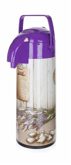 Termoska s pumpou CULINARIA LAVENDER 1,9 l, OKTermoska s pumpou CULINARIA 1,9 l LAVENDER, termoska má kovový plášť s dekorem levandule, pumpa je vyrobena v kombinaci nerez/plast, víko, rukojeť a základna je z plastu, izolační vložka skleněná.