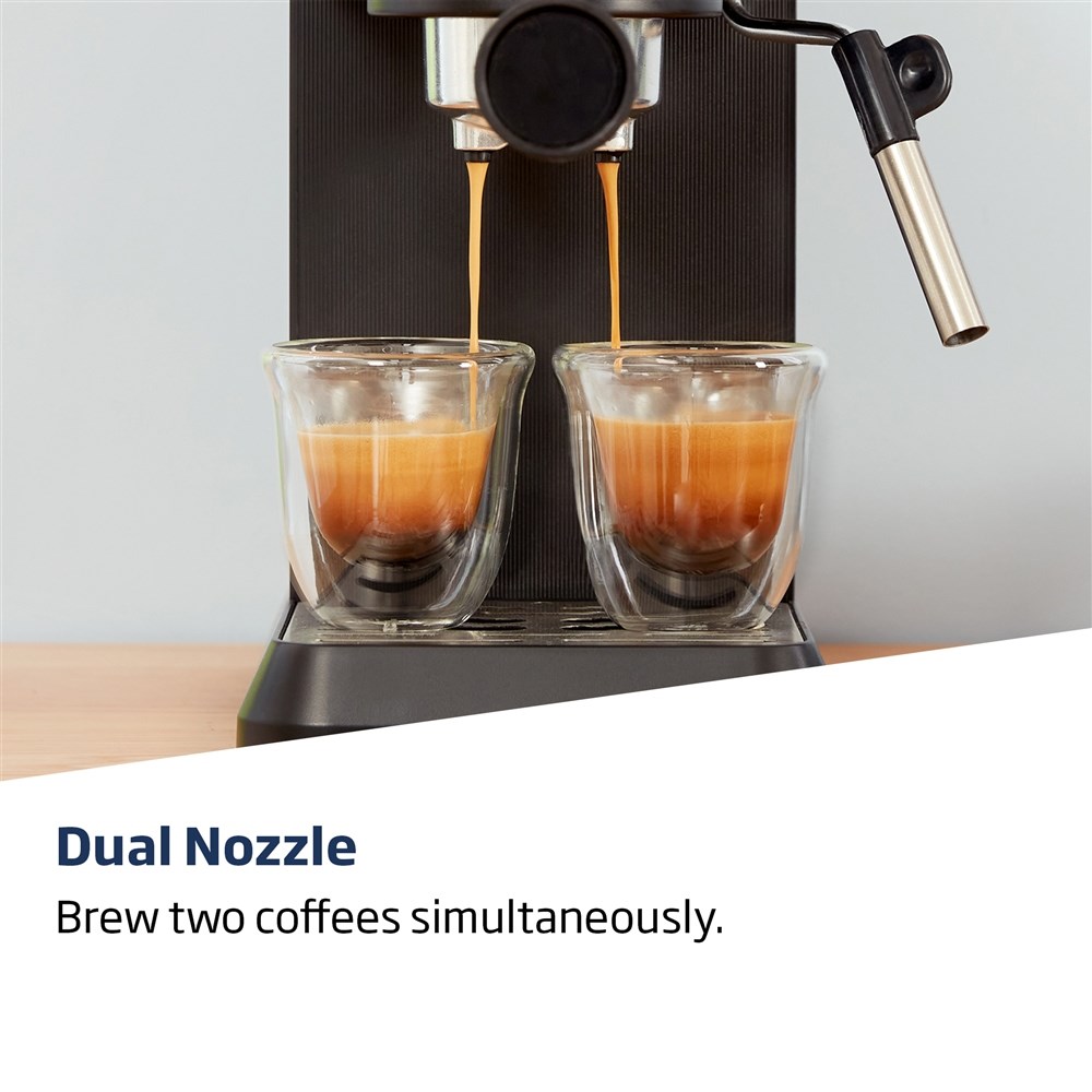 pákový kávovar • tlak 15 bar • příkon 1628 W • připraví standardní i silnější kávu • nahřívání šálků • dotykový displej • sítka pro mletou i porcovanou kávu • protiskluzové nožky • pozice pro malý i větší šálek • parní tryska na mléko • vyjímatelný zásobník na vodu • nádržka na vodu 1100 ml