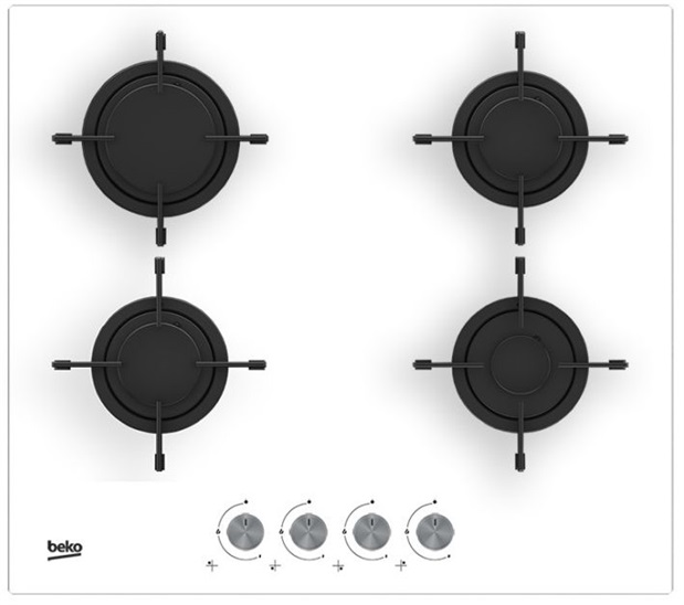 Beko HILG64220SW - plynová varná deska • 4 hořáky • bezpečnostní pojistka proti zhasnutí plamene • smaltová mřížka • integrované zapalování • mechanické ovládání • šířka 58 cm