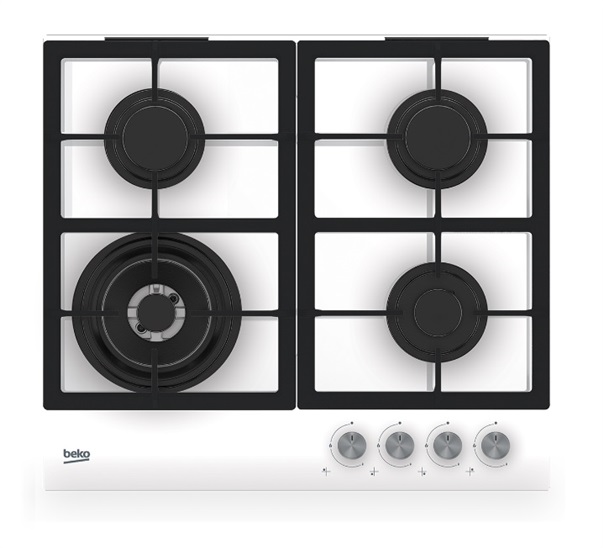 4 hořáky. (1x WOK), plyn na skle, přední ovládání, integrované zapalování, bezpečnostní pojistky, litinové rošty, bílá. Rozměry (v x š x h): 58 x 52 x 4,6 cm
