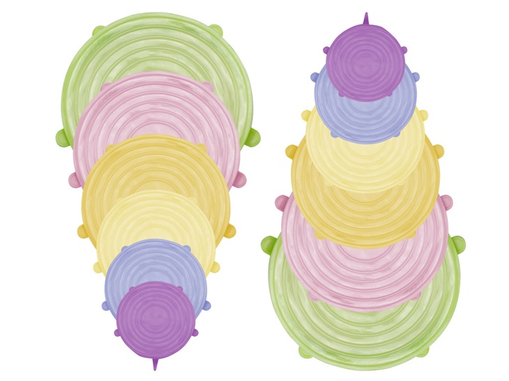 vyrobeno ze silikonu, neobsahuje BPA, ekologické, opakovaně použitelné, omyvatelné, teplotní odolnost od -20°C do +230°C, lze použít v mikrovlnné troubě, vhodné do myčky, průměr víček 6,5 cm, 9,5 cm; 11,5 cm, 14,5 cm, 16,5 cm a 20,5 cm