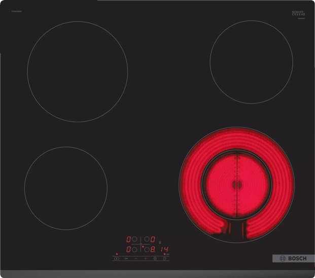 elektrická varná deska, 60cm, 4 varné zóny, z toho 1 dvouokruhová, ukazatel zbytkového tepla pro každou varnou zónu, ovládání TouchSelect, funkce ReStart, dětská pojistka, komfort profil - fazeta vpředu