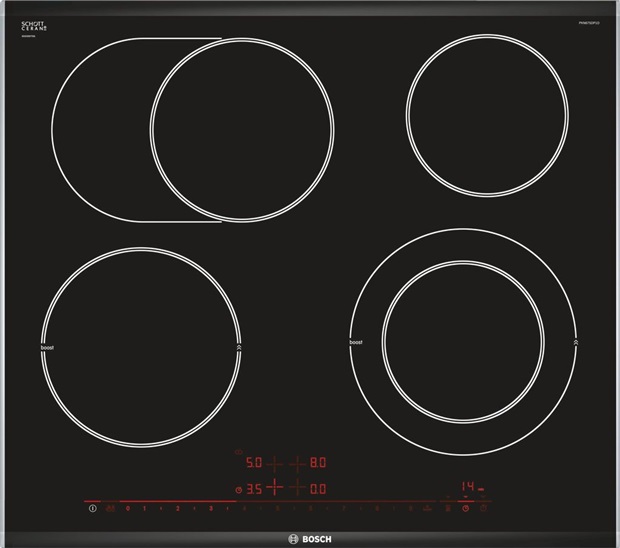 sklokeramická varná deska, 60cm, 4 varné zóny, z toho 1 dvouokruhová a 1 pečicí zóna, 2stupňový ukazatel zbytkového tepla pro každou varnou zónu, ovládání DirectSelect Premium, funkce ReStart, funkce PowerBoost, dětská pojistka, ukazatel spotřeby energie, komfort profil