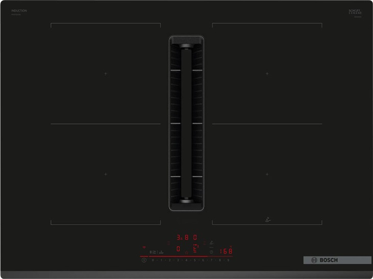 indukční varná deska s odsáváním, 70 cm, 4 indukční varné zóny, z toho 2x CombiZone, ovládání DirectSelect+, PerfectFry Plus sensor, 17 stupňů výkonu, příkon: 7,4 kW, fazeta vpředu; odsavač par: EcoSilence Drive, normální stupeň 500 m3/hod, intenzivní stupeň 622 m3/hod, hlučnost odsávání při normálním stupni min./max.: 42/68 dB, odnímatelný tukový filtr a jednotka pro zachycení tekutin, vhodné pro mytí v myčce