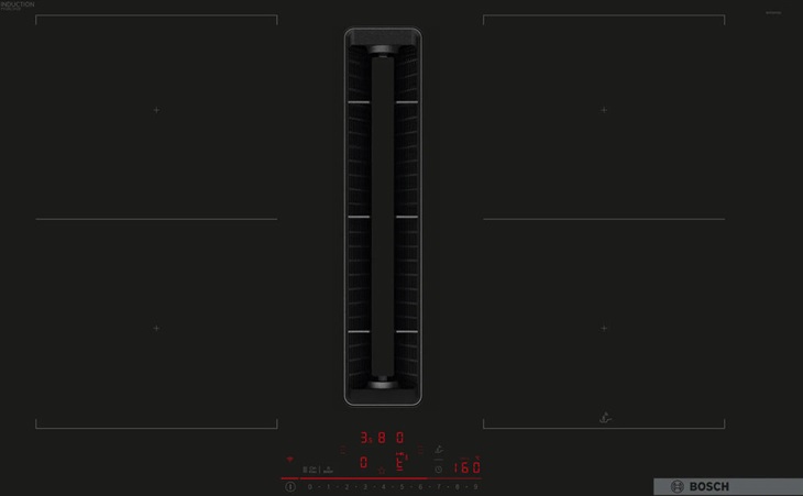 indukční varná deska s odsáváním, 80 cm, 4 indukční varné zóny, z toho 2x CombiZone, ovládání DirectSelect+, PerfectFry Plus sensor, 17 stupňů výkonu, příkon: 7,4 kW, design bez rámečku; odsavač par: EcoSilence Drive, normální stupeň 500 m3/hod, intenzivní stupeň 622 m3/hod, hlučnost odsávání při normálním stupni min./max.: 42/68 dB, odnímatelný tukový filtr a jednotka pro zachycení tekutin, vhodné pro mytí v myčce