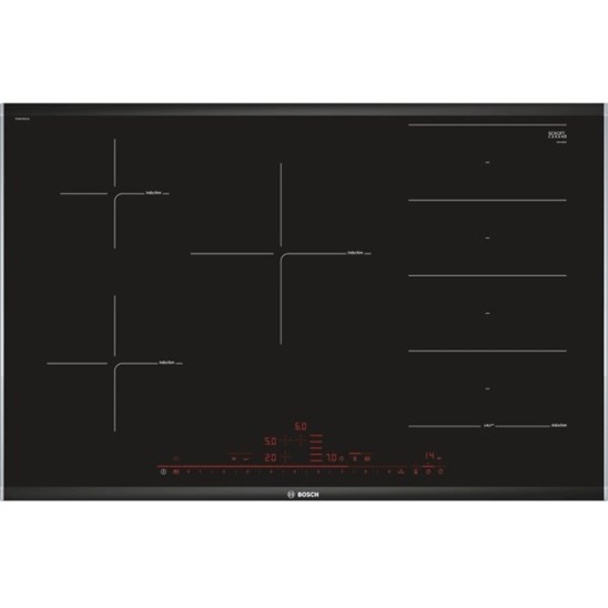 5 zón, z toho 1 flexindukce, DirectSelect Premium, senzor PerfectFry, PowerMove, timer, QuickStart, ReStart, 2stupňový ukazatel zbytkového tepla, powerBoost, 17 st výkonu, šířka 80 cm, Komfort profil