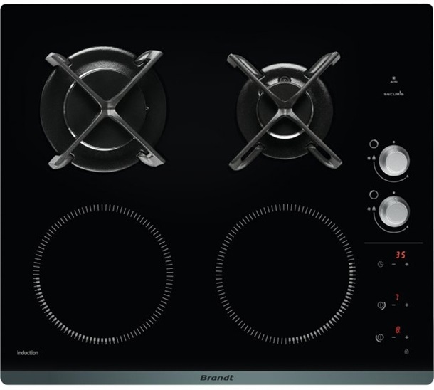 2 indukční zóny + 2 plynové hořáky, dotekové ovládání s digitálním displejem + otočné voliče, časovač, dětská pojistka, indikace zbytkového tepla, automatická detekce nádoby, balíček 10 bezpečnostních prvků + Plyn: robustní a odolné litinové rošty a hořáky, termo pojistka Securis, černé sklo