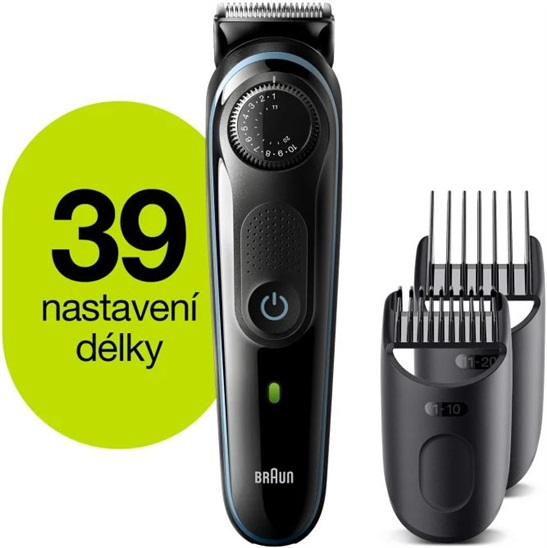 Zastřihovač vousů s vylepšeným výkonem, který má ostřejší hrany a zvětšení plochy mezi břity o 13 %k zachycení a zastřižení více vousů. 39 možností nastavení délky (0,5 - 20 mm) po 0,5mm krocích, doživotně ostré břity, motor se senzorem hustoty vousů, nástavec 1-10 mm, nástavec 11-20 mm, žiletka Gi