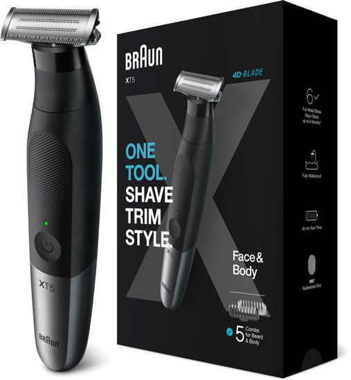 Braun Series X XT5100 - holicí strojek • holí, zastřihuje a zarovnává • hřebeny pro vousy (1, 2, 3, 5 mm) a pro tělo (0 mm) • 4D-Blade • 450 pohybů za sekundu • hlavice vydrží ostrá až 6 měsíců • hřeben SkinGuard pro citlivá místa • pogumovaná rukojeť • vodotěsný