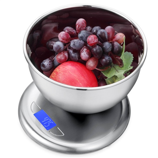 jednoduché ovládání; funkce dovažování; váživost do 5 kg; napájení 2xAAA; digitální displej; automatické vypnutí; povrch z kvalitní nerez oceli; nerezová miska - 1,5 l