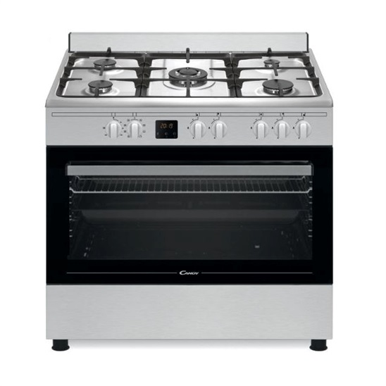 CANDY CCGMEE9025PX/E - kombinovaný sporák • energetická třída A • 5 hořáků • objem trouby 96 l • 8 druhů ohřevu • ohřívací zásuvka • pyrolytické čištění • otočné ovládání • displej/hodiny • 78,7×89,8×60,1 cm