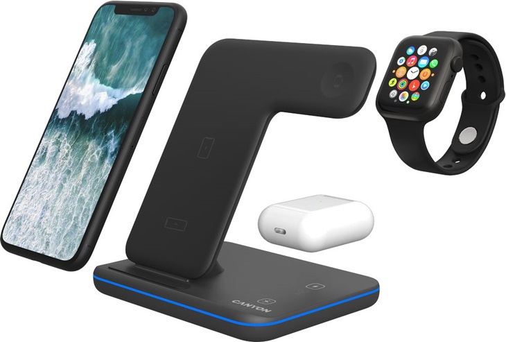 bezdrátová nabíjecí stanice podporující QI; nabíjí 3 zařízení současně; čipová sada Nuvoton; protiskluzová pogumovaná základna; dotykové tlačítko pro ovládání podsvícení; LED indikátor a podsvícení; 4 typy ochrany; kabel USB-C 1,2 m součástí balení; kompatibilní s Apple Watch / iPhone / Airpods