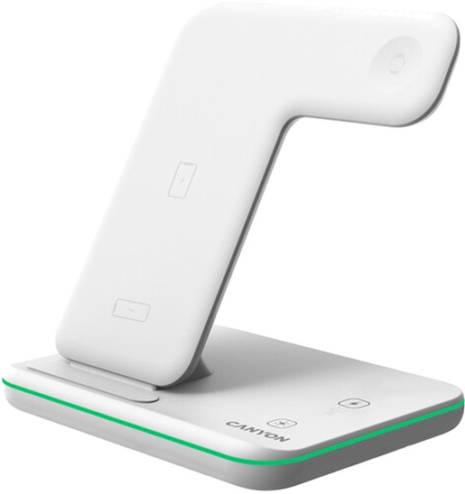 bezdrátová nabíjecí stanice podporující QI; nabíjí 3 zařízení současně; čipová sada Nuvoton; protiskluzová pogumovaná základna; dotykové tlačítko pro ovládání podsvícení; LED indikátor a podsvícení; 4 typy ochrany; kabel USB-C 1,2 m součástí balení; kompatibilní s Apple Watch / iPhone / Airpods