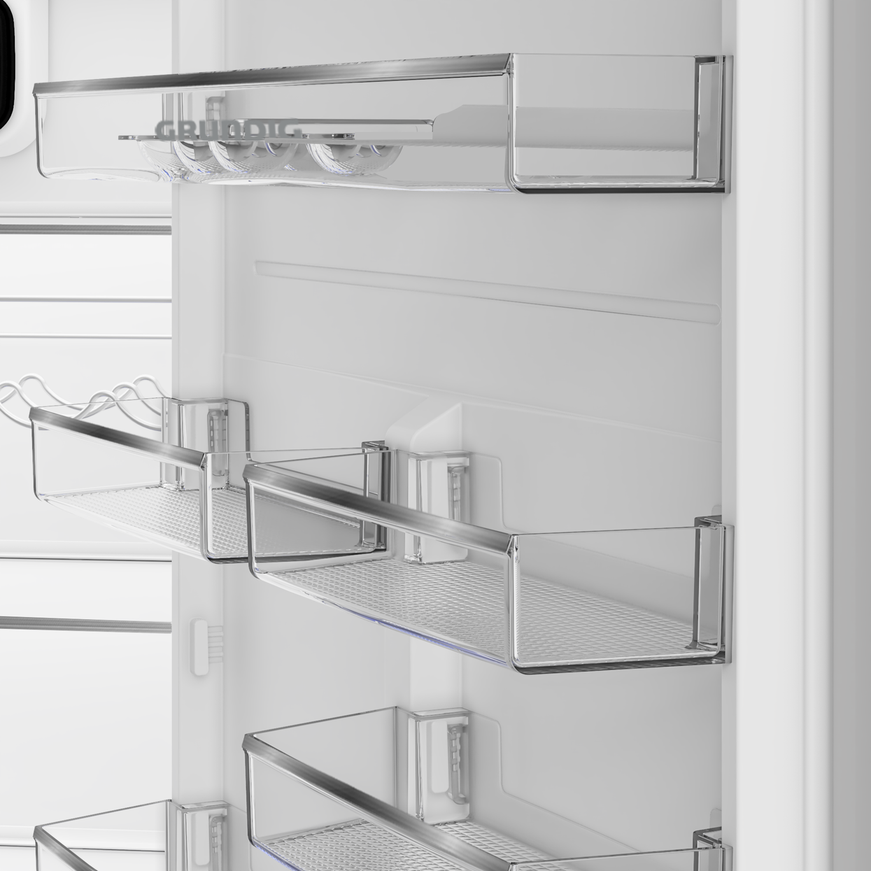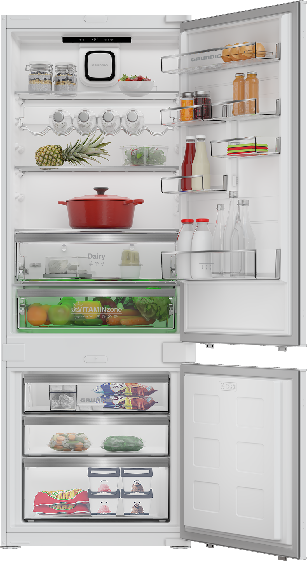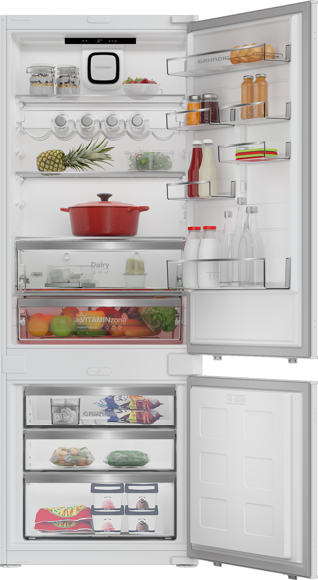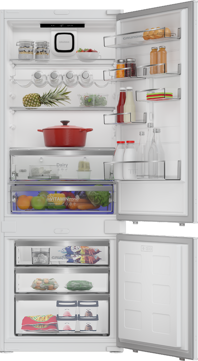 Prémiová vestavná chladnička Grundig o šíři 69 cm s vynikajícím a objemným vnitřním prostorem (280 l chladnička a 90 l mrazák) díky jedinečné Maxi výšce 194,5 cm. Přihrádka VitamineZone se střídáním světla pro uchování vitamínů a čerstvosti AeroFresh rychlejší chlazení, lepší distribuce chlazení, méně úniků teploty.