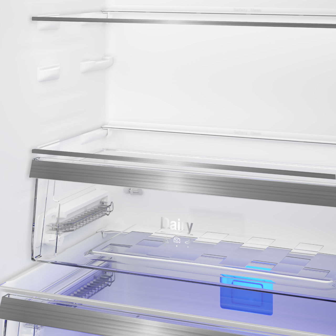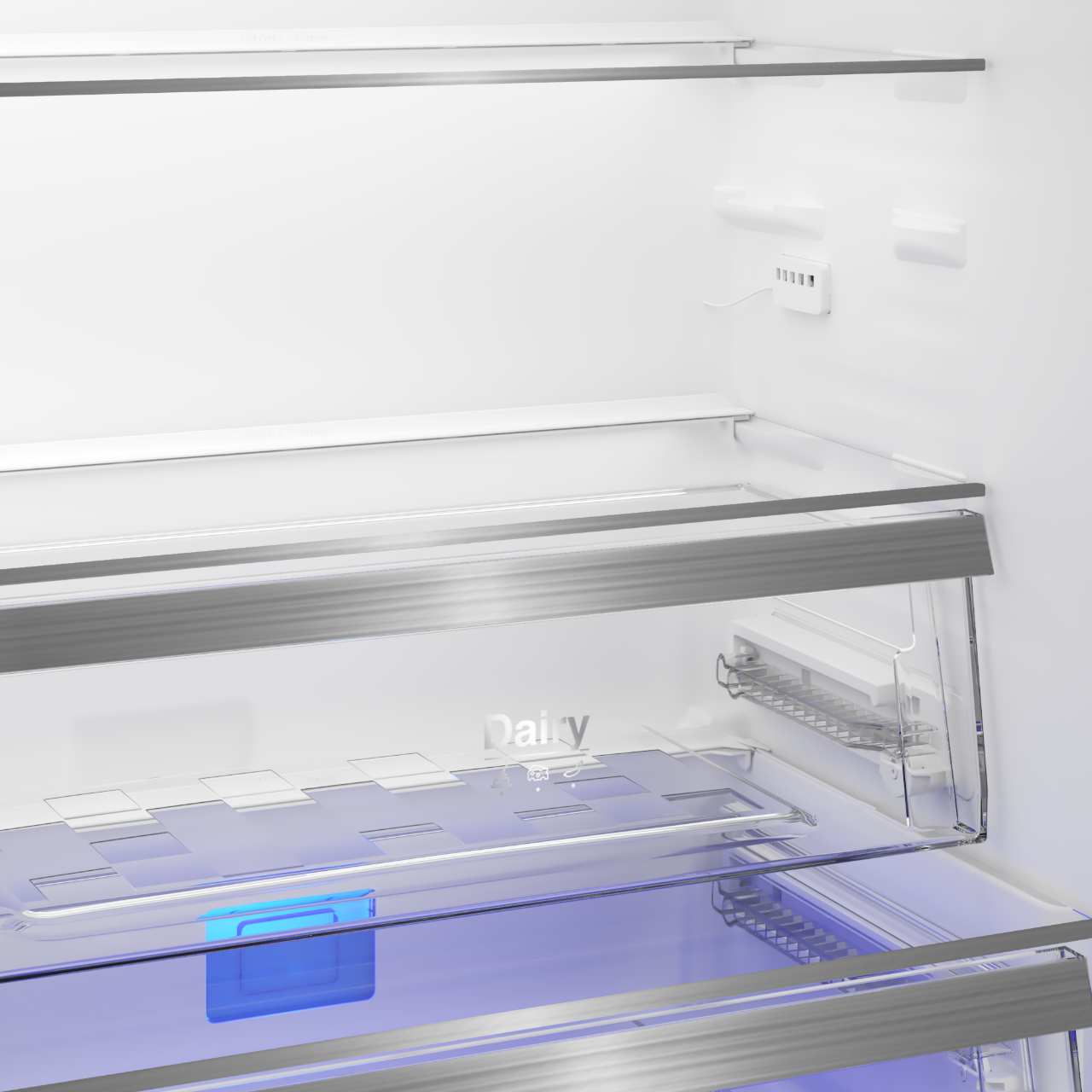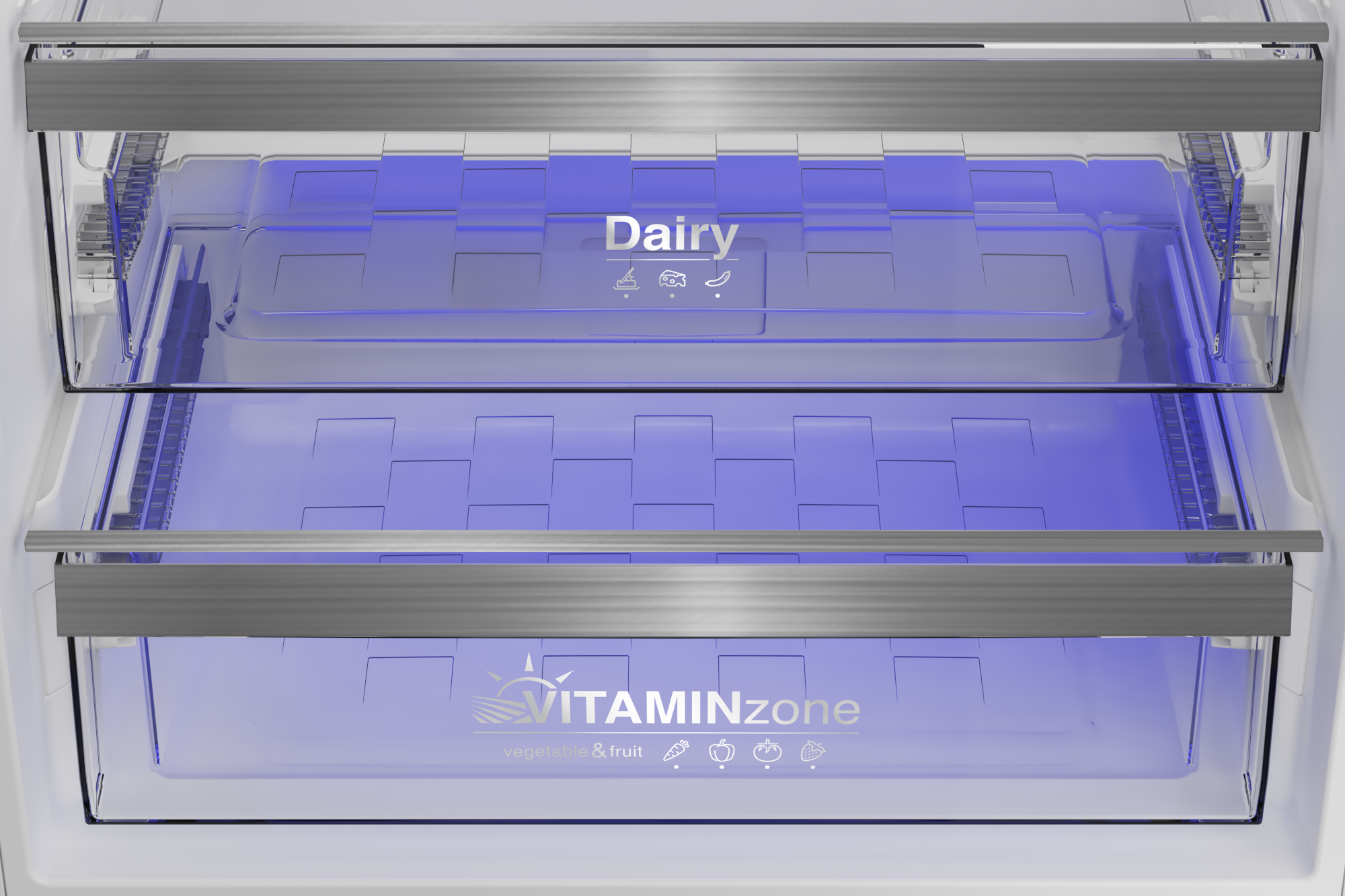 Chladící část: objem 280 l; vnitřní LED osvětlení; 1 pevná + 3 nastavitelné police z bezpečnostního skla; VitaminZone - zásuvka na ovoce a zeleninu; kovový držák lahví; 2 standardní a 4 půlené závěsné přihrádky ve dveřích; držák na vajíčka