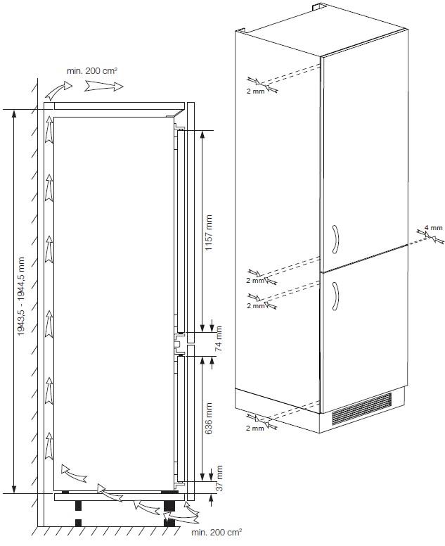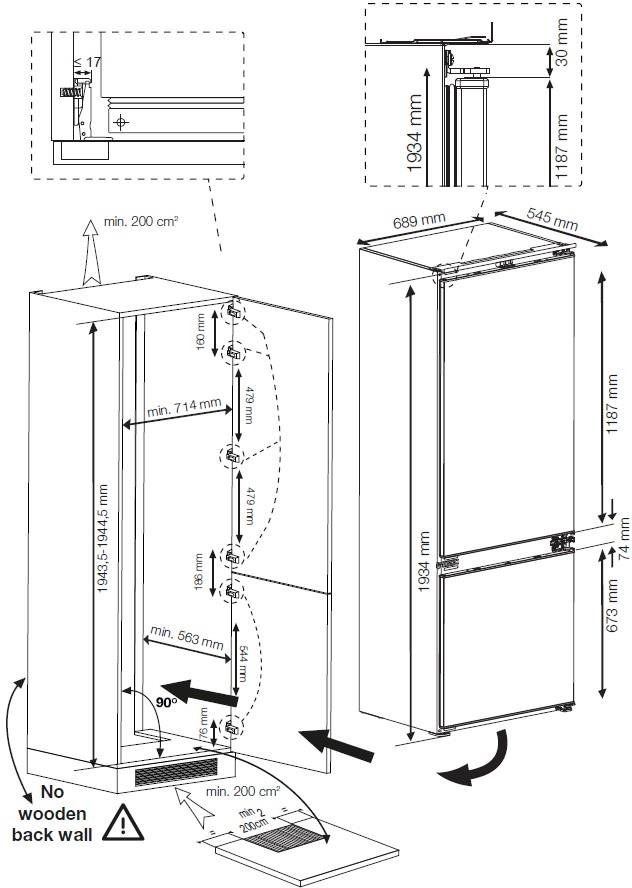 Vestavná kombinovaná chladnička; Nulová zóna; en. třída D; celkový hrubý objem 370 l; možnost změny směru otevírání dveříl; kluzné panty pro vestavbu do kuchyňské linky; Přihrádka VitamineZone se střídáním světla pro uchování vitamínů a čerstvosti; AeroFresh rychlejší chlazení, lepší distribuce chlazení, méně úniků teploty; režim Eco, Dovolená, FastFreeze; spotřeba el. energie: 198 kWh/rok; hlučnost pouze 35 dB; rozměry (V x Š x H): 194,5 x 69 x 55 cm.
