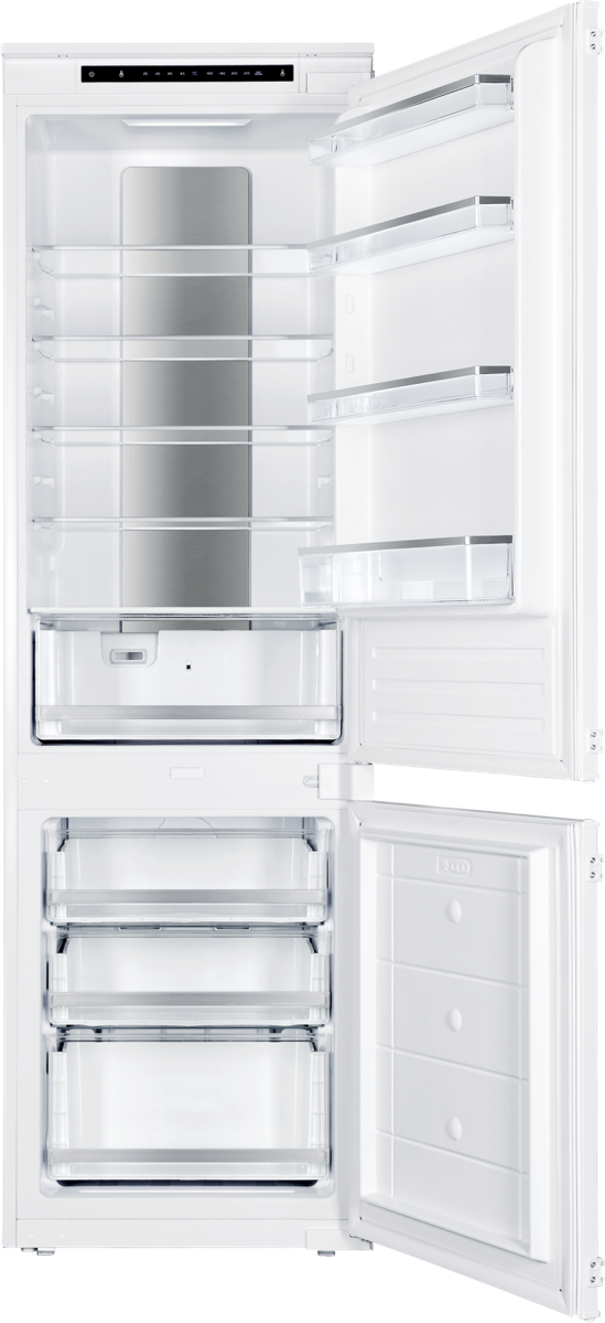 Vestavná kombinovaná chladnička Kluge KCN2273J No Frost, Metal Cooling - nerezová zadní stěna uvnitř chladícího prostoru; en. třída E; celkový čistý objem 270 l; elektronická regulace teploty; možnost změny směru otevírání dveří; lišty pro vestavbu; spotřeba el. energie: 227 kWh/rok; akumulační doba (výdrž bez proudu) 10 h; hlučnost 41 dB; rozměry (VxŠxH): 193,7 x 54,0 x 55,0 cm; hmotnost 62 kg.
