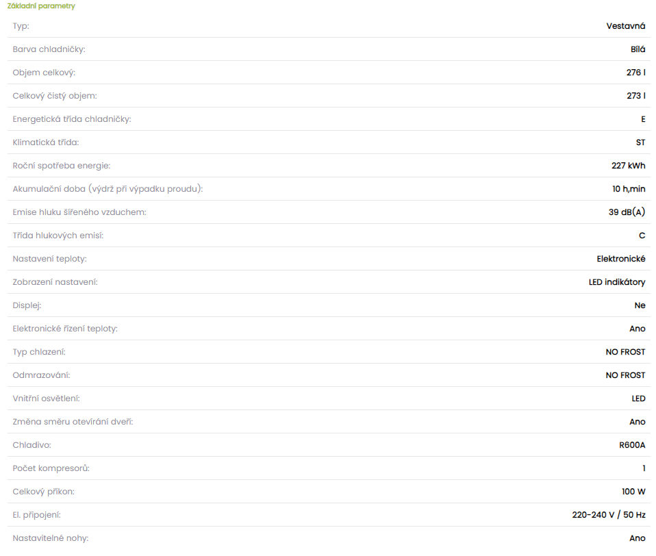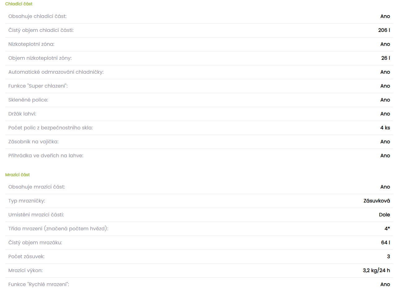 Chladící část: objem 206 l; systém No Frost; funkce Super chlazení; vnitřní LED osvětlení; nízkoteplotní zóna 2°C o objemu 26l; 4 nastavitelné police z bezpečnostního skla; 3 standardní přihrádky a přihrádka na lahve ve dveřích; držák na vajíčka