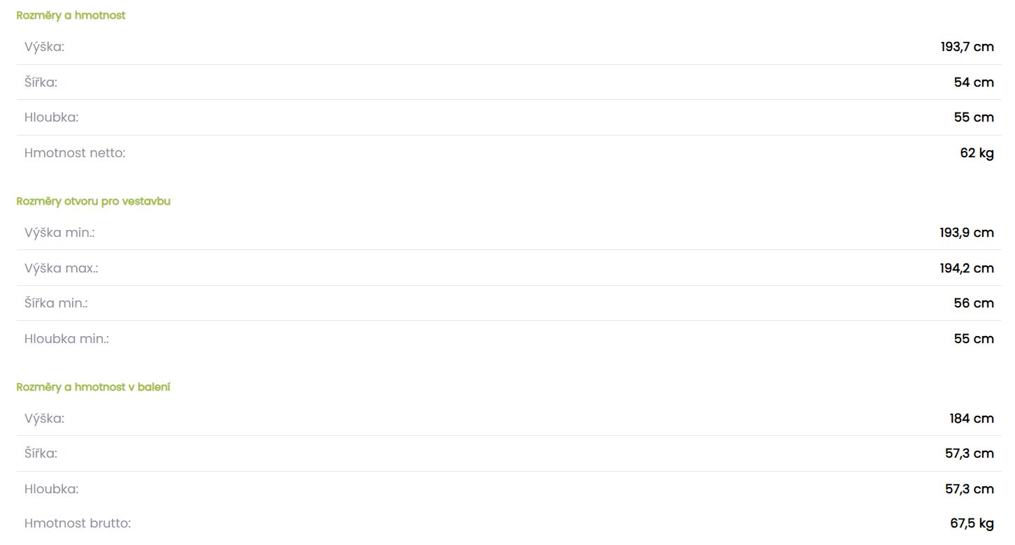 Mrazící část: objem 64 l; systém No Frost; funkce Rychlé mrazení; mrazící výkon 3,2 kg/24 h; 3 výsuvné přihrádky; forma na ledové kostky