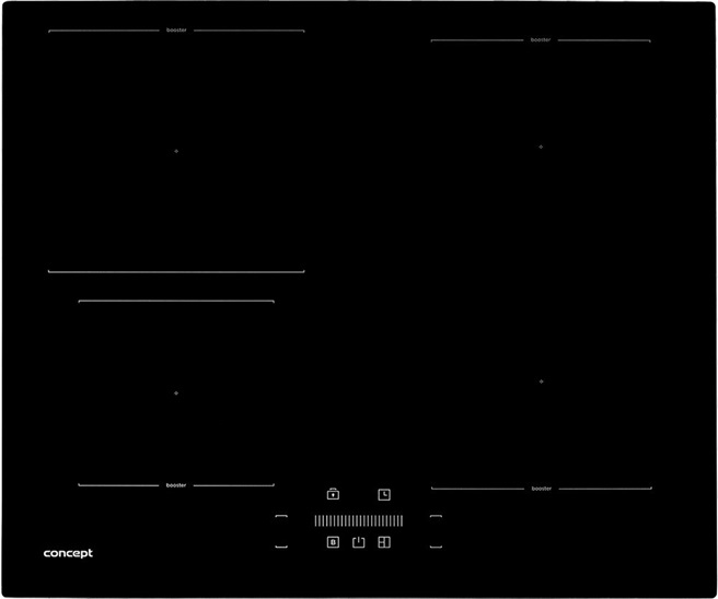 Concept IDV5160 - indukční varná deska • 4 varné zóny • připojení k síti 230/400 V • maximální příkon 7400 W • Slider • Power Booster • Flexi zóna • displej • automatické vypnutí • časovač • dětská pojistka • dotykové ovládání • šířka 59 cm