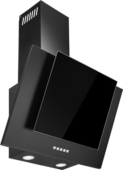 Dekorativní šikmý komínový odsavač par 60 cm, provedení černé sklo, max. výkon odtahu 740 m3/h
