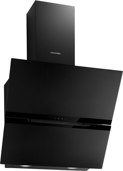 Dekorativní šikmý komínový odsavač par 60 cm, provedení černé sklo, max. výkon odtahu 740 m3/h
