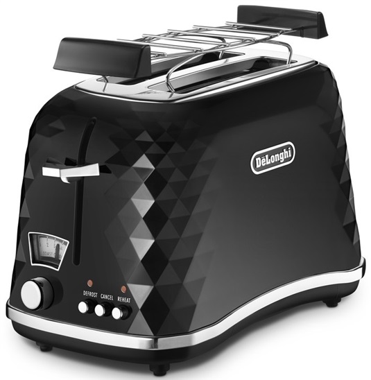 topinkovač • pro 2 ks topinek • 3D design • funkce rozmrazování • opětovný ohřev • tlačítko STOP • světelná indikace provozu • nástavec na větší pečivo • vyjímatelný tác na drobky • protiskluzové nožičky • tlačítkové a otočné ovládání • příkon 900 W