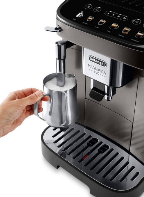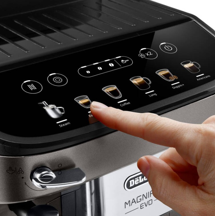 Kávovar De'Longhi Magnifica Evo je velmi intuitivní díky dotykovému ovládacímu panelu a vestavěnému displeji. Uživatelský zážitek je navíc podpořen funkcemi pro snadné čištění a údržbu, jako je automatické proplachování a filtrace vody.