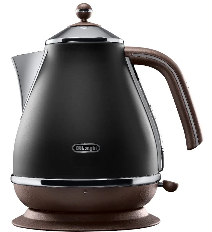 De'Longhi Icona Vintage KBOV2001.BK - rychlovarná konvice • objem 1,7 l • příkon 2000 W • automatické vypínání v případě dosažení bodu varu • ukazatel hladiny vody • omyvatelný filtr • 360° otočná základna • světelná signalizace provozu • skryté topné těleso
