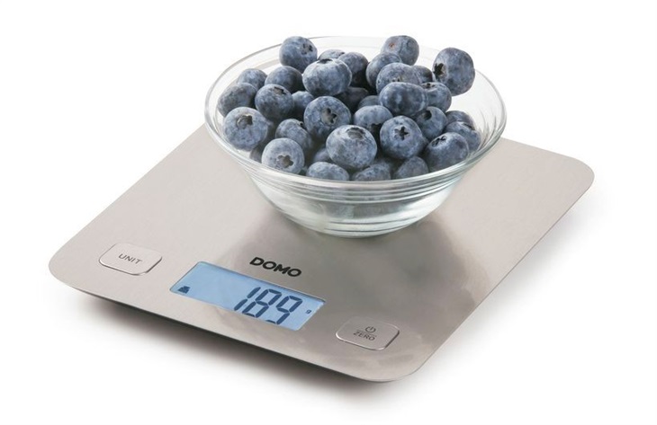 Stylová digitální kuchyňská váha s nerezovým povrchem nezachytávajícím otisky prstů a nečistoty. Přesné vážení po 1 g až do 5 kg s funkcí dovažování. Velký modře podsvícený LCD.