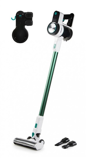 tyčový vysavač; 21,6V Li-Ion baterie; motor 110 W; síla sání 10 kPa; 2 stupně výkonu; doba nabíjení 4-5h; výdrž na jedno nabití až 40 min; odnímatelný ruční vysavač; cyklónový systém s HEPA filtrem; hubice s elektricky poháněným kartáčem; prachový kartáč, štěrbinová hubice; nabíjecí stanice