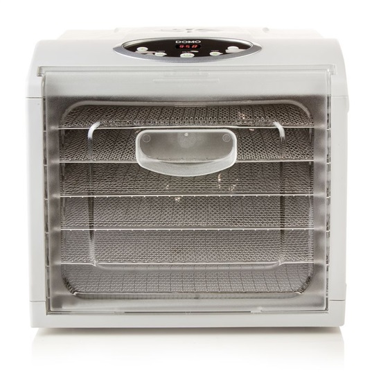 DOMO DO353VD - sušička ovoce a potravin • průhledná vysunovací dvířka • ovládací LCD panel • 6 nerezových sušicích plat (33 × 30,4 cm) • nastavitelná doba sušení 30 minut – 19,5 hodiny • sušení v rozmezí od 35 °C do 70 °C • časovač • max. hlučnost 55 dB • bezpečnostní spínač
