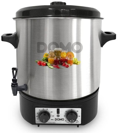 DOMO DO 42323PC zavařovací hrnec • objem 27 l • příkon 2000 W • pojme až 22 zavařovacích sklenic (0,75 l) a 4 malé zavařovací sklenice (0,5 l) • časovač až na 120 minut • funkce nepřetržitého provozu • skrytá tepelná spirála • ochrana proti přehřátí a chodu nasucho • termostat od 30 do 100 °C • plastový výpustný kohout • světelná kontrolka provozu • 2 otočné knoflíky • také pro přípravu svařeného vína, guláše, polévek • hmotnost 4,1 kg • 1m přívodní kabel