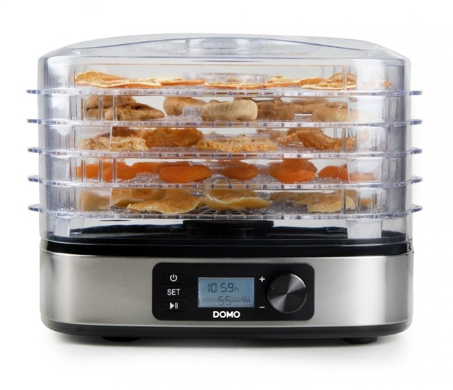 Sušička na ovoce, houby i zeleninu s digitálním nastavením teploty 35-75 °C. Digitální časovač až na 36 hod. 5 průhledných sušících plat umístěných v patrech na sobě. LCD displej.