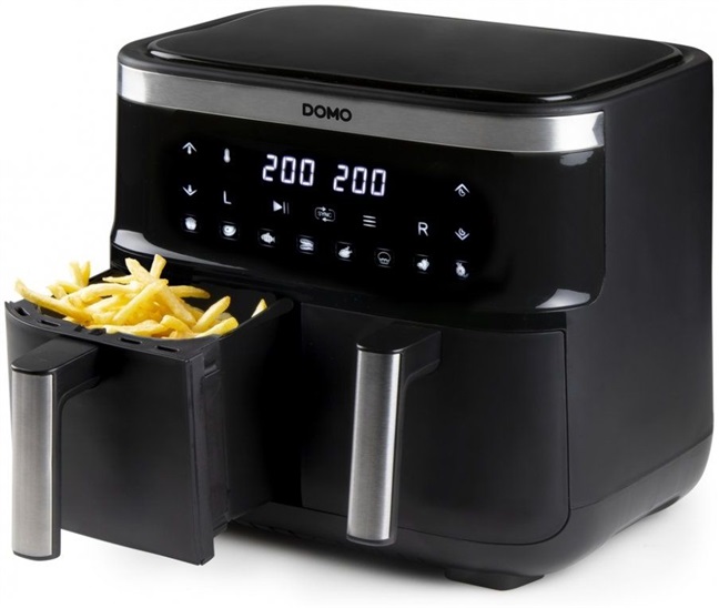 celkový příkon 2850 W, horkovzdušná bez oleje, objem 2 x 4 l, kapacita 2 x 1,2 kg surovin, nastavitelná teplota, časovač na 60 min, LED panel, dotykové ovládání