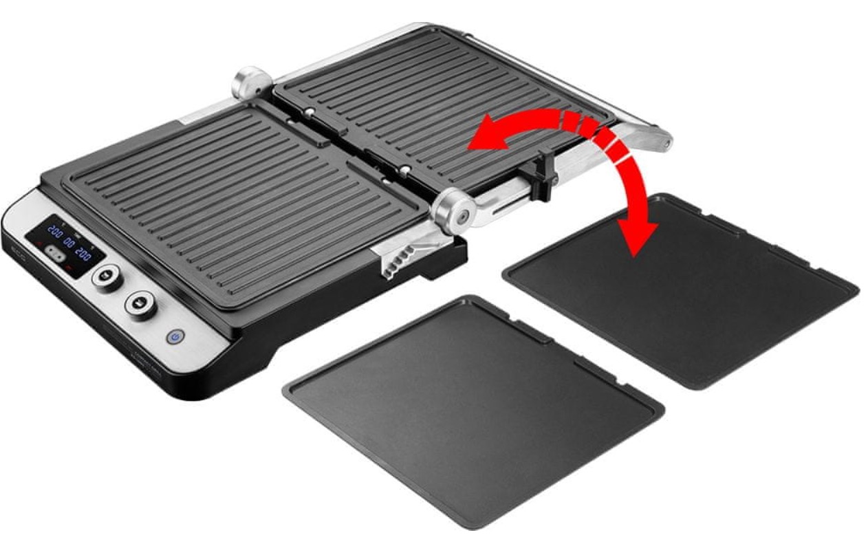 Součástí balení jsou dva sety vyjímatelných grilovacích desek. Profilovaná sada je ideální pro grilování nejen masa, ale i zeleniny. Využijete ji také při zapékání. Hladké desky se perfektně hodí na přípravu steaků a burgerů. Oceníte je také při snídani, kdy si na nich připravíte vejce či omeletu. Kontaktní gril KG 1000 Gourmet lze zcela otevřít (v úhlu 180°) a využít tak obě grilovací desky, čímž se vám zdvojnásobí plocha na přípravu vašich specialit. Při plném otevření tzv. BBQ poloze můžete využít nadstandardní funkci BBQ Booster. Automaticky tak zvýšíte výkon grilu, aniž by došlo k tepelným ztrátám. Při zapékání je možné nastavit 6 úrovní odstupu horní desky od spodní podle velikosti pokrmu, který právě připravujete. |