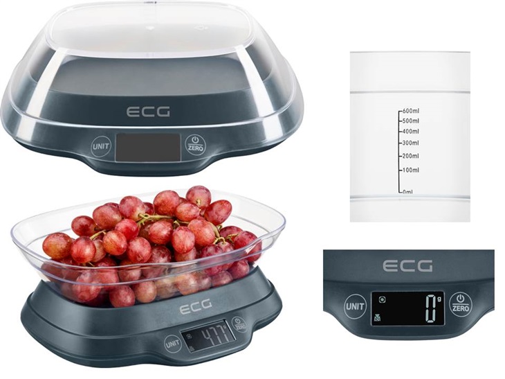 praktická odnímatelná miska, extra velký LCD displej, max. nosnost 5 kg, měřící rozlišení 1 g, vážení tekutin, funkce dovažování s praktickou funkcí TARA, možnost volby jednotek (g/lb.oz, ml/fl.oz), 2*1.5V AAA (nejsou součástí balení)