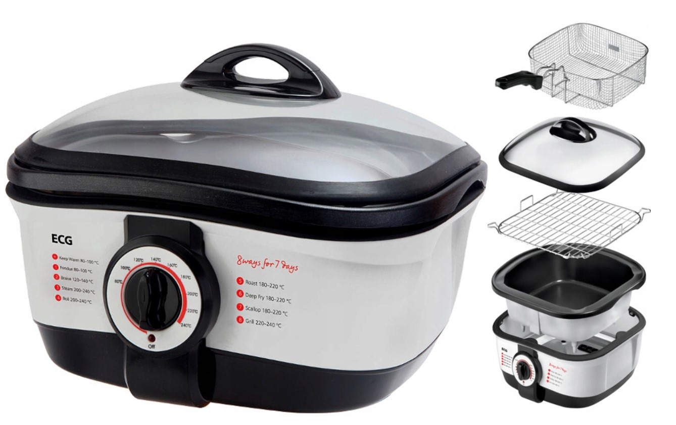 Vyjímatelná teflonová miska o objemu 5l. Možnost kontroly procesu vaření díky průhledné poklici z tvrzeného skla. Perfektní do každé kuchyně, zabírá málo místa, veškeré příslušenství se vejde do mísy přístroje.