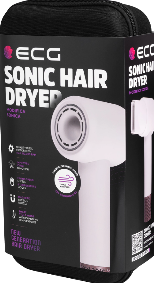 S vysoušečem vlasů ECG Modifica Sonica budou mít vaše vlasy po každé koupeli i sprše tu nejlepší péči. Tento elegantní a výkonný fén je totiž důkladně vysuší vlasy za zlomek času, než běžné vysoušeče. Krátké vlasy vysuší už do 1 minuty a dlouhé do 5 minut. Díky výkonnému ionizátoru a nastavitelné teplotě i rychlosti je budete přímo hýčkat. Vlasy budou zdravější a plné života. Velmi praktickou vychytávkou je zde navíc i magnetický koncentrátor (nástavec, jenž k fénu snadno pevně uchytíte pomocí magnetu), kterým můžete zúžit proud vzduchu pro přesnější styling a vhod přijde i luxusní cestovní box s přihrádkou na další nezbytnosti.