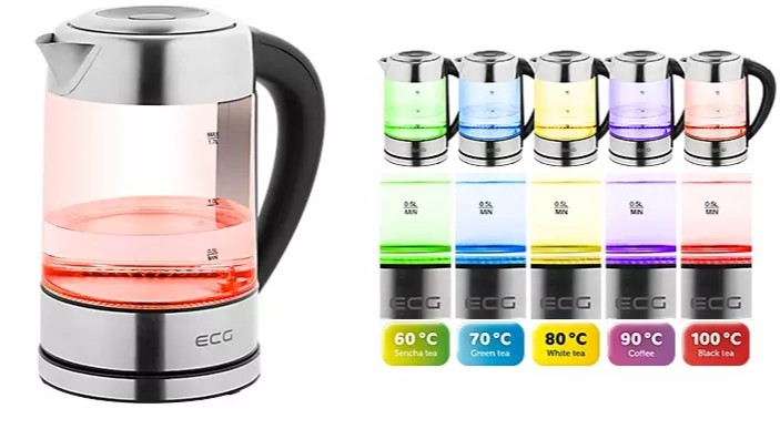 Zcela jistě nejvýraznějším prvkem rychlovarné konvice ECG RK 1777 Colore jsou pestré barvy jejího podsvícení, měnící se na základě konfigurace konkrétních teplot.