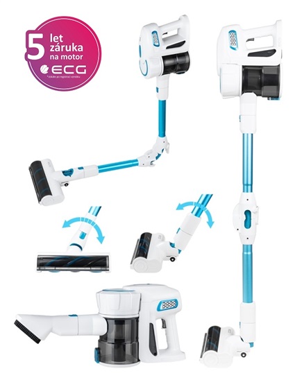 Cyklónový tyčový vysavač 2v1 ECG VT 5220 2in1 Flex Clean - tyčový bezsáčkový vysavač • 22,2V Li-Ion baterie (2200 mAh) • cyklonový motor • výkon 150 W • síla sání 6/10 kPa • zásobník na nečistoty o objemu 500 ml • doba nabíjení 4,5 h • výdrž na jedno nabití až 30 / 15–20 min • indikátor plnosti nádoby • odnímatelný ruční vysavač • HEPA filtr H12 • 2 výměnné kartáče vhodné na tvrdé podlahy i koberce • flexi ohebná hubice • stírací poduška • prachový kartáč • hmotnost 3,29 kg
